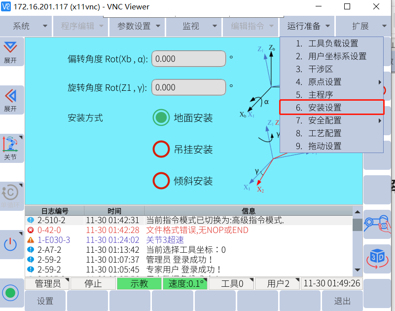 地面安装:当机器人基座平行于大地且正装时,我们需要选择地面安装。