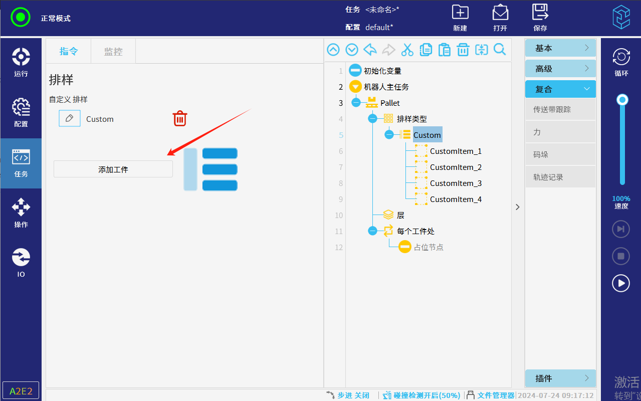 ● 自定义排样:点击自定义排样节点,可重命名排样类型的节点名称,并添加或删除“工件”节 点,自定义排样是指在不规则的码垛情况下,用户需自己示教该层点位。