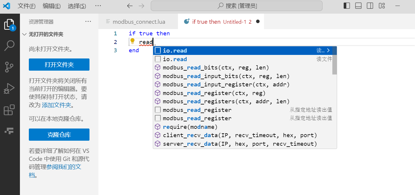 当扩展插件安装成功时,使用该脚本语言写程序时会有自动补全和代码提示功能。