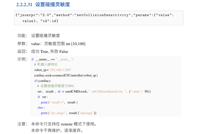 通过8055端口,发送设置碰撞灵敏度指令:{"jsonrpc":"2.0","method":"setCollisionSensitivity","params":{"value": value}, "id":id}