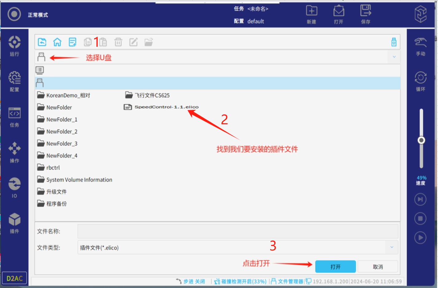 CS机器人在与外部设备进行通讯时,通常会使用机器人内部的寄存器进行信息交互,机器人自带可查看modbus寄存器,关于布尔寄存器、整数寄存器、浮点数寄存器的查看可安装寄存器监控器插件进行查看,插件文件询问米兰·(milan)中国人员方可获得,存放至U盘内,并插入机器人示教器或控制柜USB接口。