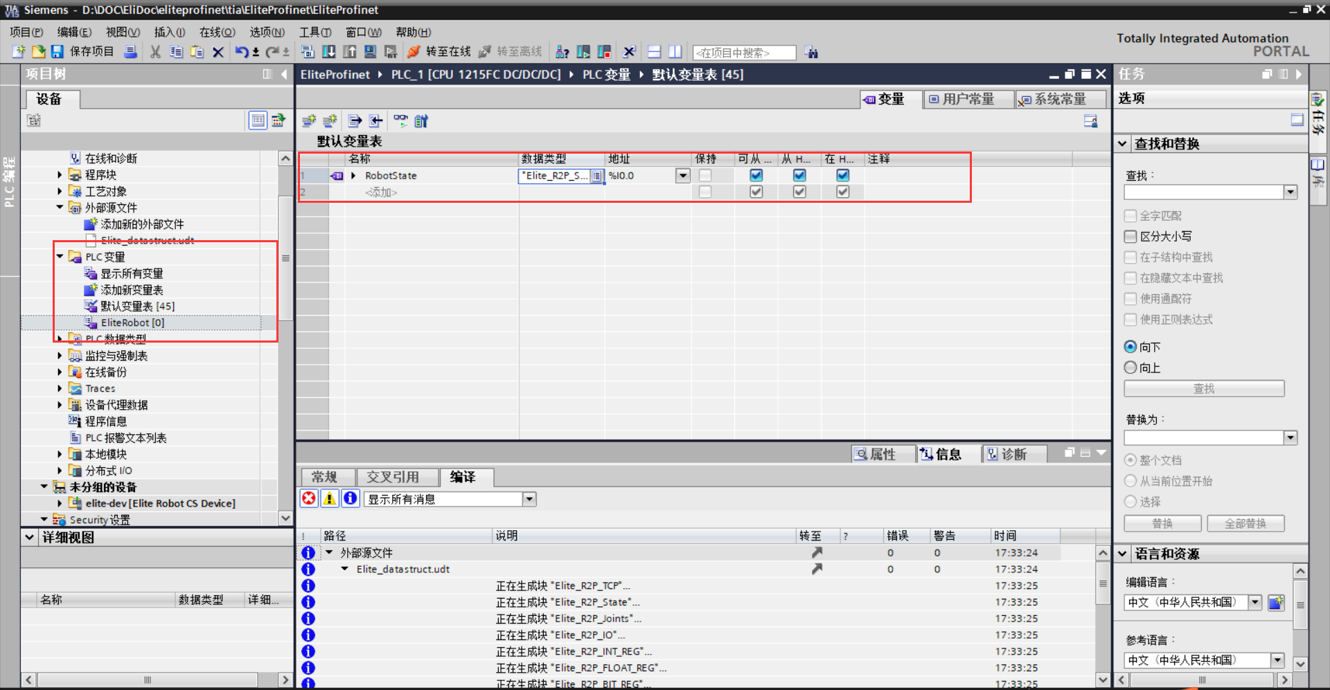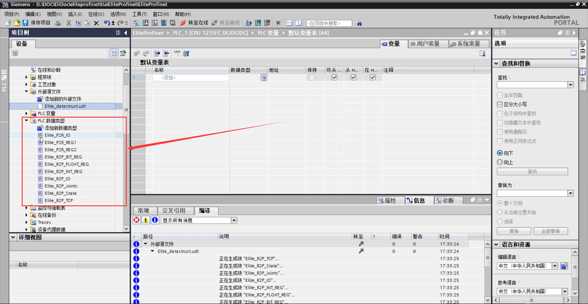 左侧项目树中选择“外部源文件> 添加新的外部文件> Elite_datastruct.udt”,如图 3-7(a) 所示;右键“Elite_datastruct.udt> 从源生成块”,对弹窗点击确定,如图 3-7(b)所示;左侧 项目树中展开 PLC 数据类型,可看到相关数据类型,如图 3-7(c)所示