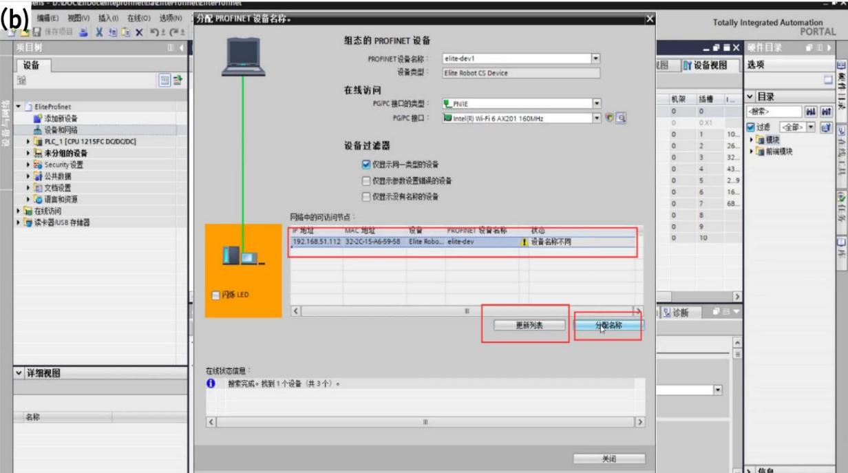 6. 在设备视图中右键设备选择“分配设备名称”,搜索并更改设备名称,如图 3-10(a)和 如图 3-10(b)所示。
