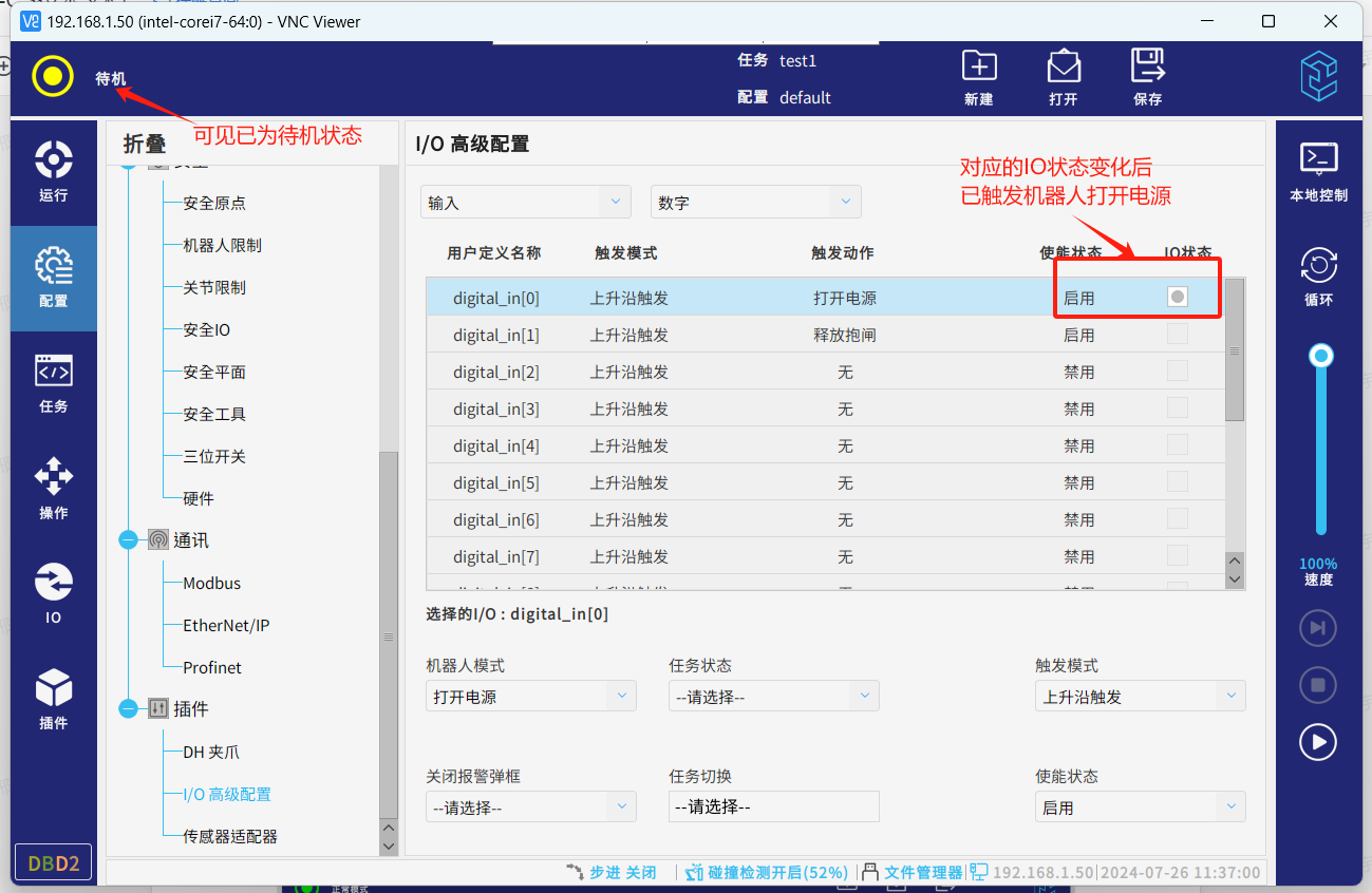 安装成功后进入配置,插件,IO高级配置,就可配置对应的IO来触发对应的功能或者绑定对应的IO来接收机器人的状态变化。