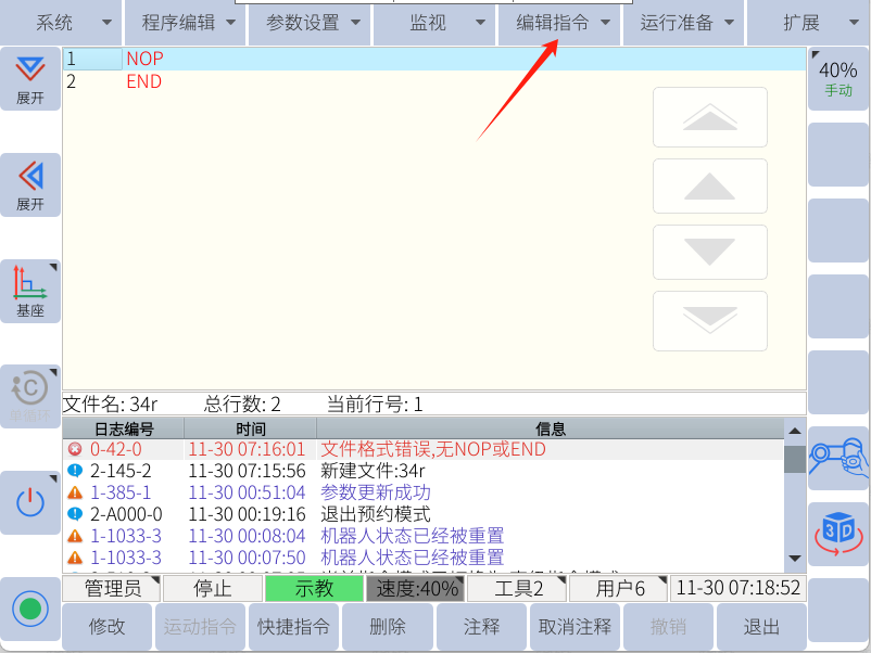 2.进入程序后,编辑指令功能块亮起,此时所有的JBI指令都在编辑指令里