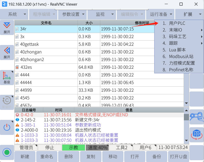 1. 用户PLC的编写只能在示教器上,在扩展-用户PLC中。