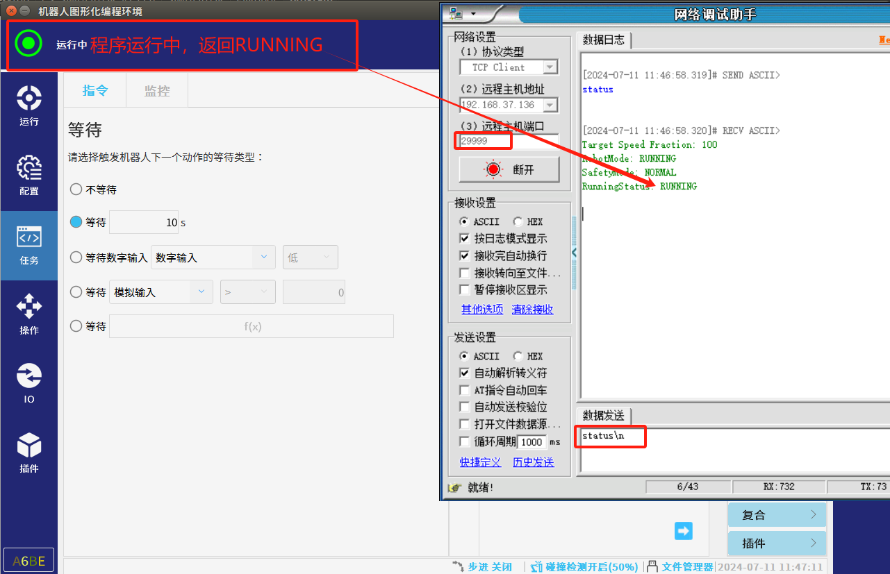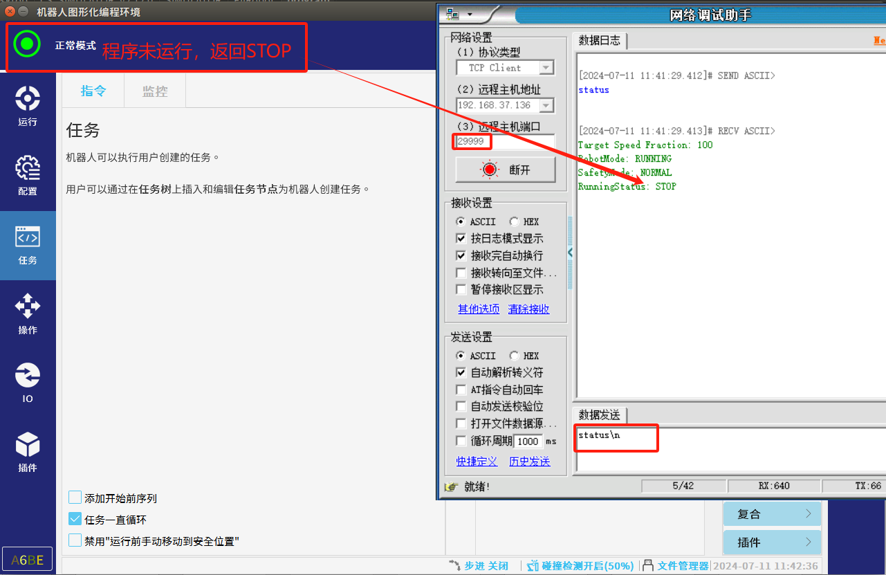 因为当我们想修改全局变量时机器人处于非运行状态时需要用到29999端口对全局变量进行修改,机器人处于运行状态时需要用到30001端口对全局变量修改,所以建议在修改全局变量前判断机器人是否为运行状态,可以通过29999端口,发送status\n获取机器人当前程序状态,需注意的是 dashboard shell 命令默认需以“\n”作为结束输入标识符,因此在发送命令时要以“\n”结 尾,否则将被认为未完成输入,不会被响应。