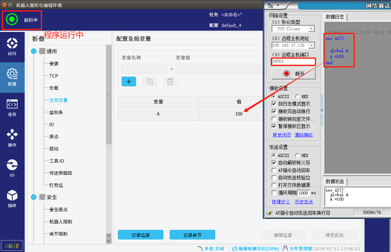 1.  程序未运行时只能通过29999端口修改全局变量,程序运行时只能通过30001端口修改全局变量。