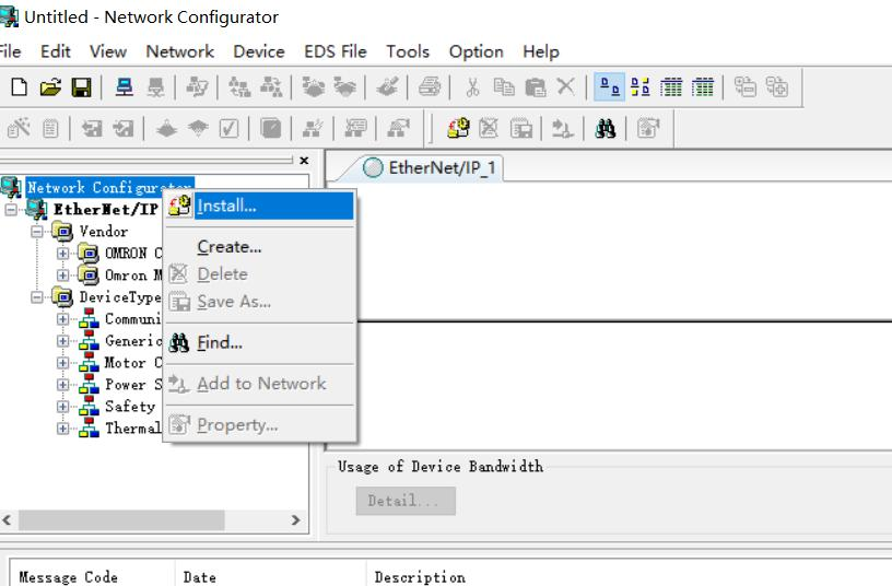 2、  首先打开Network,这个软件可以帮我们看到适配器插槽对应变量的大小,以及目标变量,右击左边栏Network Configurator图标,选择install,找到对应的EDS文件