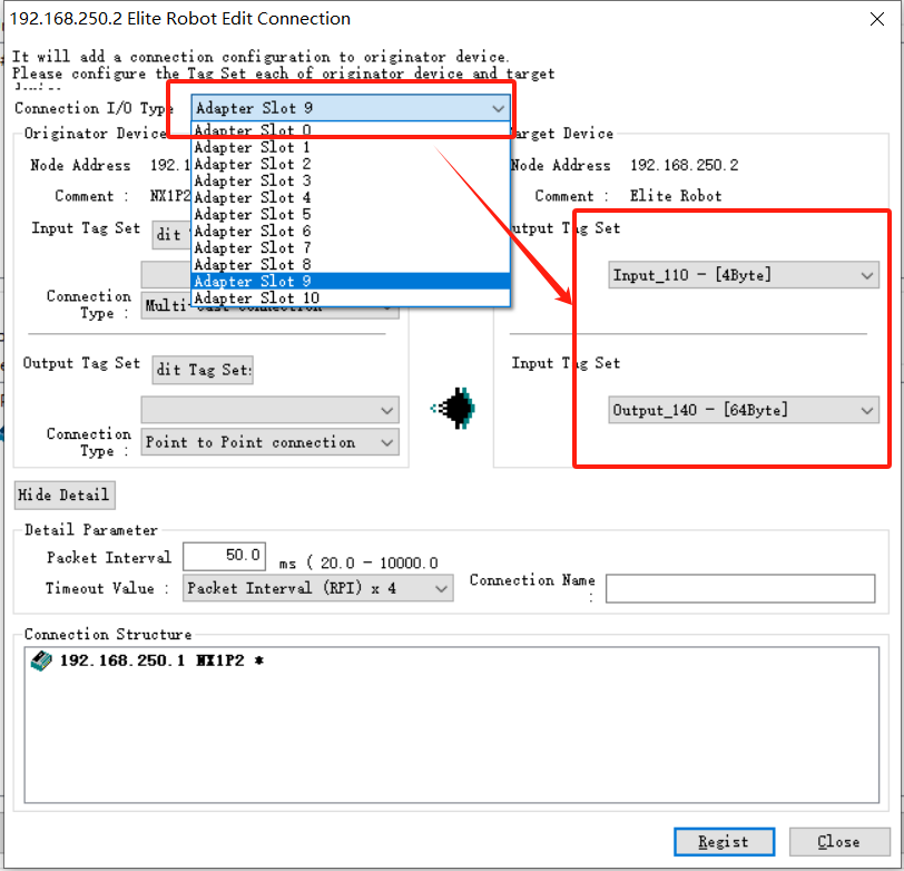 7、  出现下图既可查看对应插槽的目标变量以及需要配置的字节大小,下图中表示的就是插槽9,对应plc输出目标变量140变量大小64byte,输入目标变量110变量大小4byte。