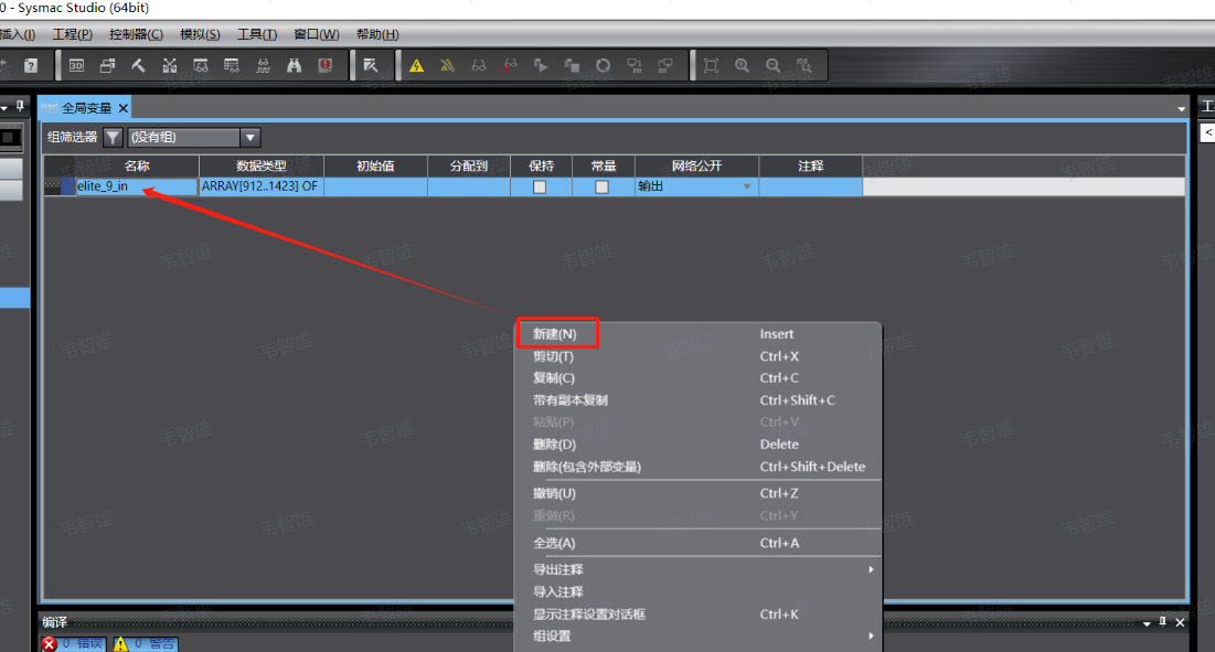 10、  由于每个插槽都有对应输入输出,所以设置完输出还需要输入,点击空白处,新建全局变 量,在数据类型中填入ARRAY[0..31] OF BOOL,网络公开设置成输入状态