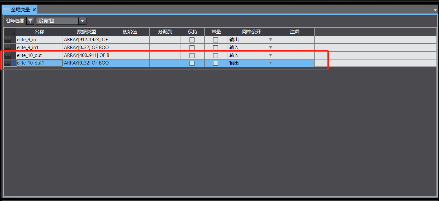 11、  续创建插槽 10,点击空白处,新建全局变量在数据类型中填入 ARRAY[400..911] OF BOOL,网络公开设置成输入状态,再次创建所需输出,点击空白处,新建全局变量,在数据 类型中填入ARRAY[0..31] OF BOOL,网络公开设置成输出状态