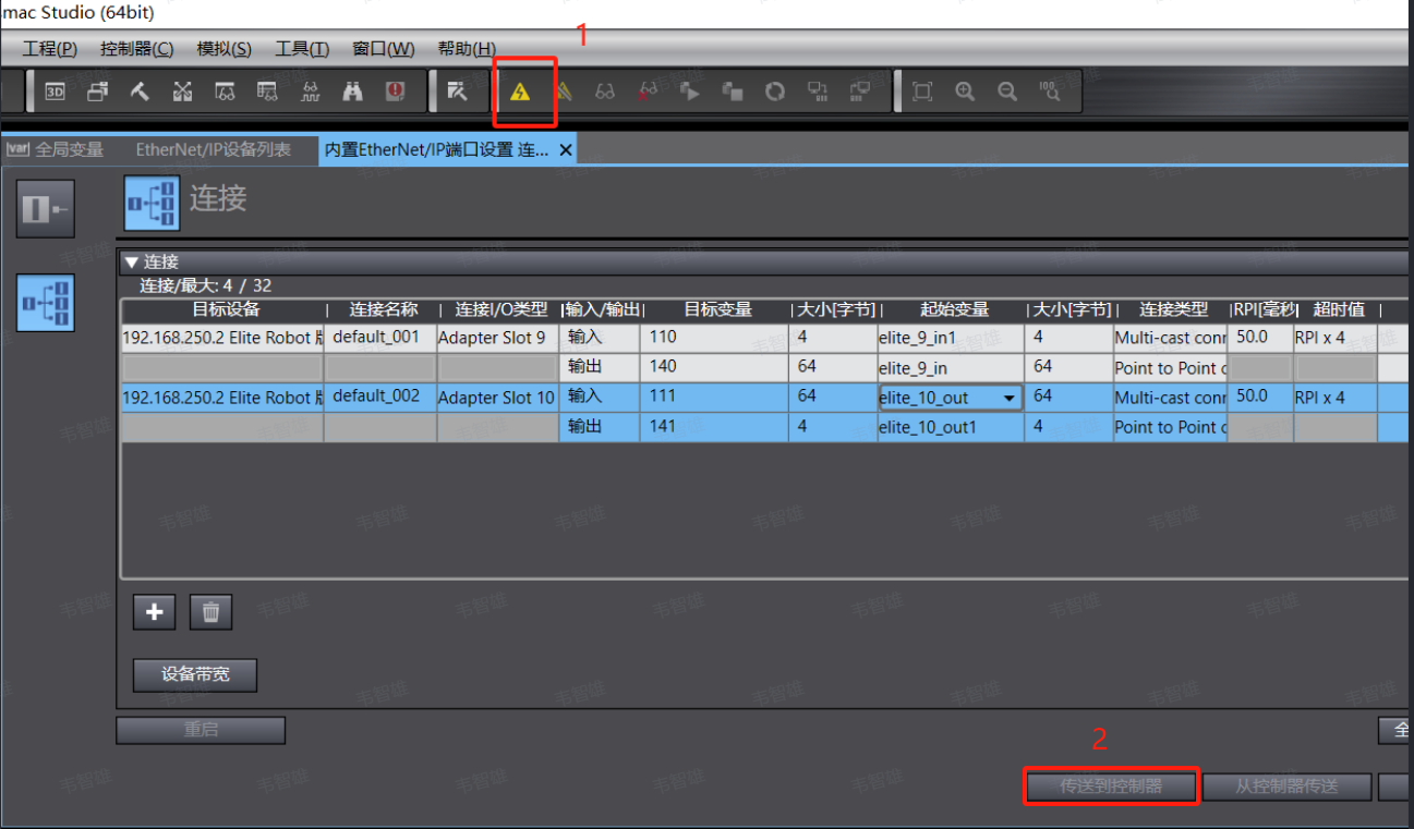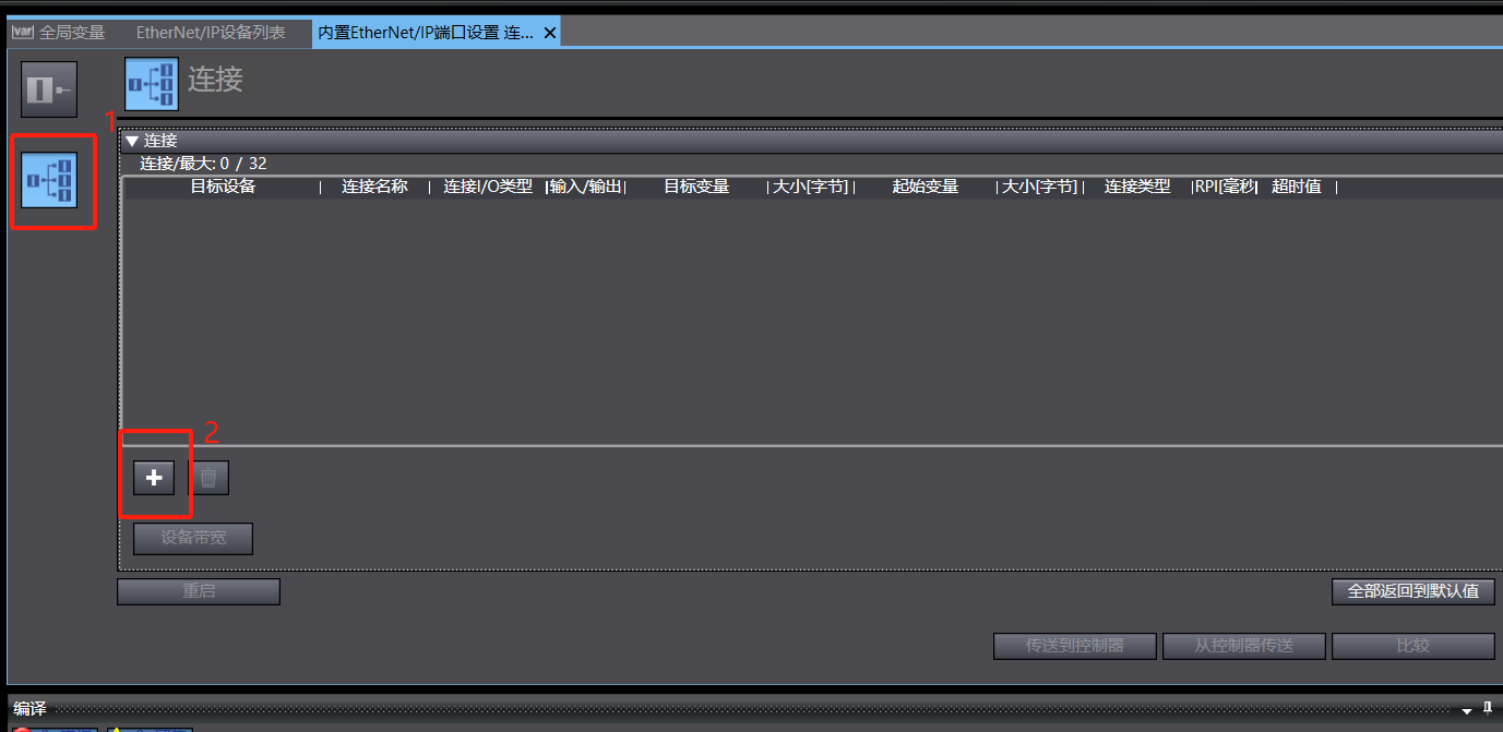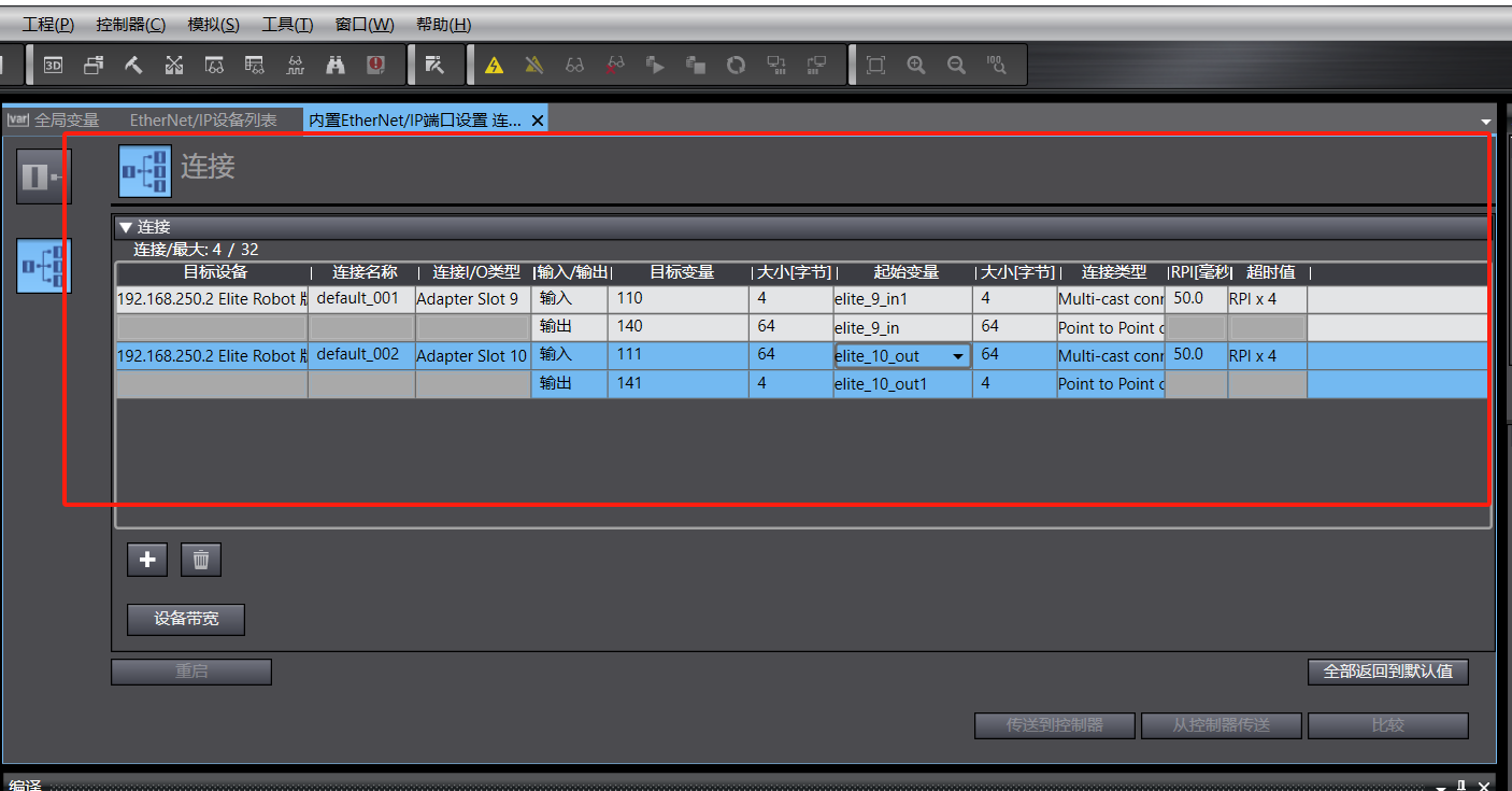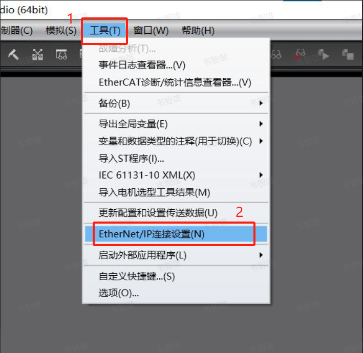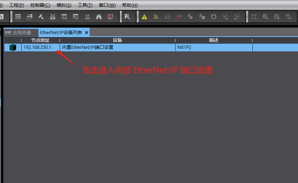 12、  全局变量设置完成后,点击上方栏工具选项,找到 EtherNet/IP 连接设置点击进入