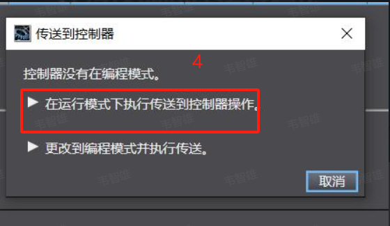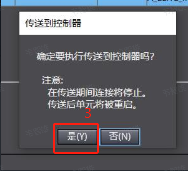 19、  设置完成后既可进行下载,点击图片中标识,将设备转至在线后点击传输到控制器,出现弹窗点击是,选择在运行模式下执行传送到控制器操作