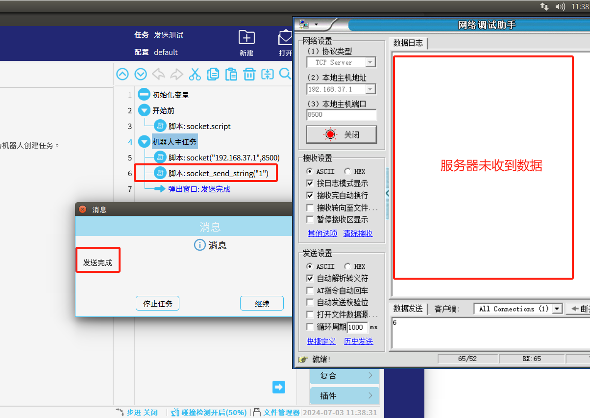 1.我们单纯的使用发送指令例如:socket_send_string(str, socket_name="socket_0")未判断发送是否成功时,如果当机器人客户端当时已经与服务器断开连接了或发送失败后程序依然往下继续运行,如图2-1所示。