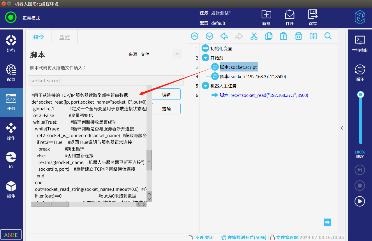 2.为了避免以上a.b两种情况发生,我们可以在接收数据之前通过“socket_is_connected()”判断与服务器连接的状态如果断开重新连接,并通过再次接收接收指令例如“socket_read_string(timeout=2)”的返回值判断是否接收到数据,返回值为0时,再次接收数据,如图3-3所示,以用下面代码3-1配合图3-3的图形化编程直接调用df脚本实现此操作。