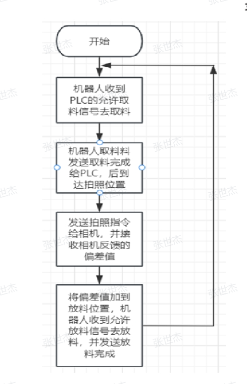 机器人到固定位置取料,然后去拍照,获取偏差值或者绝对值,以此来调整放料位置