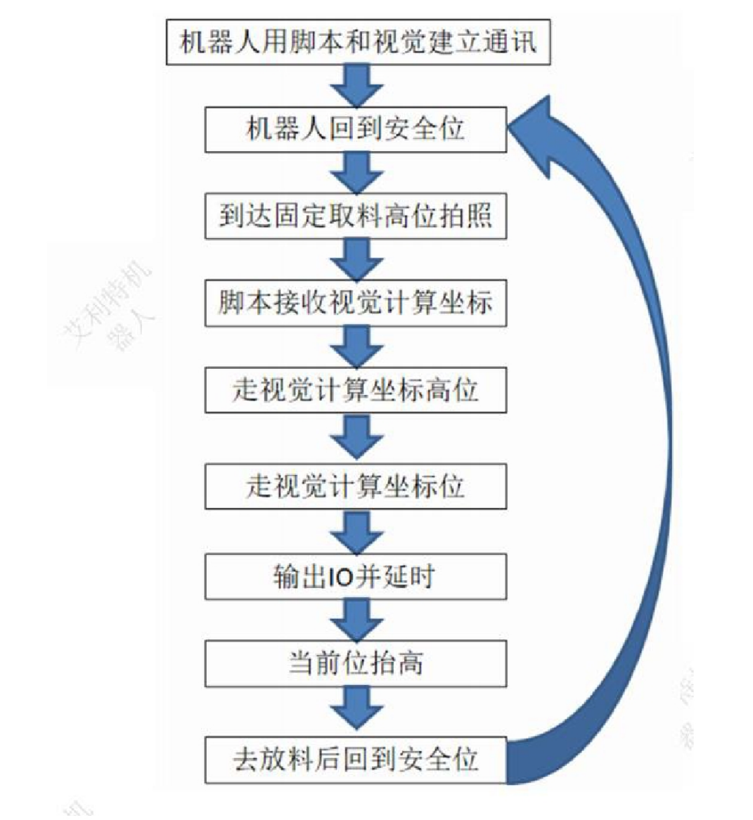 机器人收到视觉发送过来的坐标是相对值,也就是相对取料基准位的偏移,机器人在取料