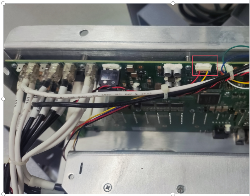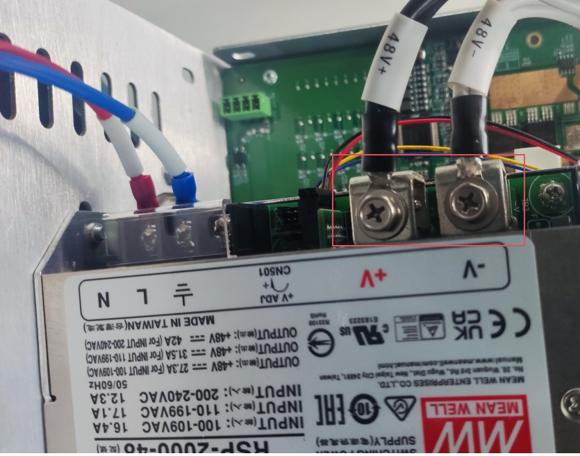 第二步:将机器人控制柜电源开关打开,将safeio板上启动48V开关电源的线束拔掉,如图-3红框标记处,用万用表测量是否有48V输出,测量点如图-4红框标记处。如果有48V输出,说明开关电源没有问题,safeio板出现故障需要现场更换或者返厂维修;