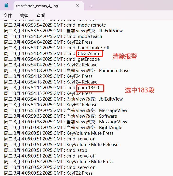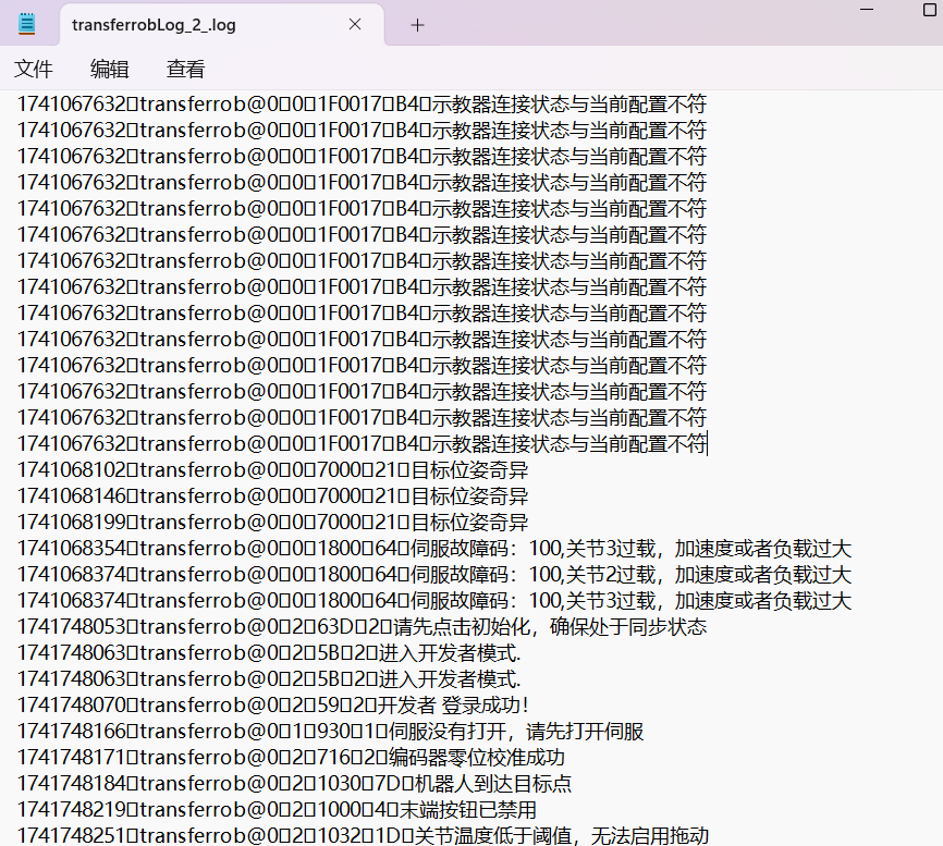 3、  该日志通过缓存刷新,如果上位机发送指令太少则不会在日志中记录,缓存到一定数量才会加载到日志中。(可通过登录网页版示教器增加缓存量,网页版示教器每 2秒自动缓存一条日志;也可上位机多发一些指令增加缓存量)