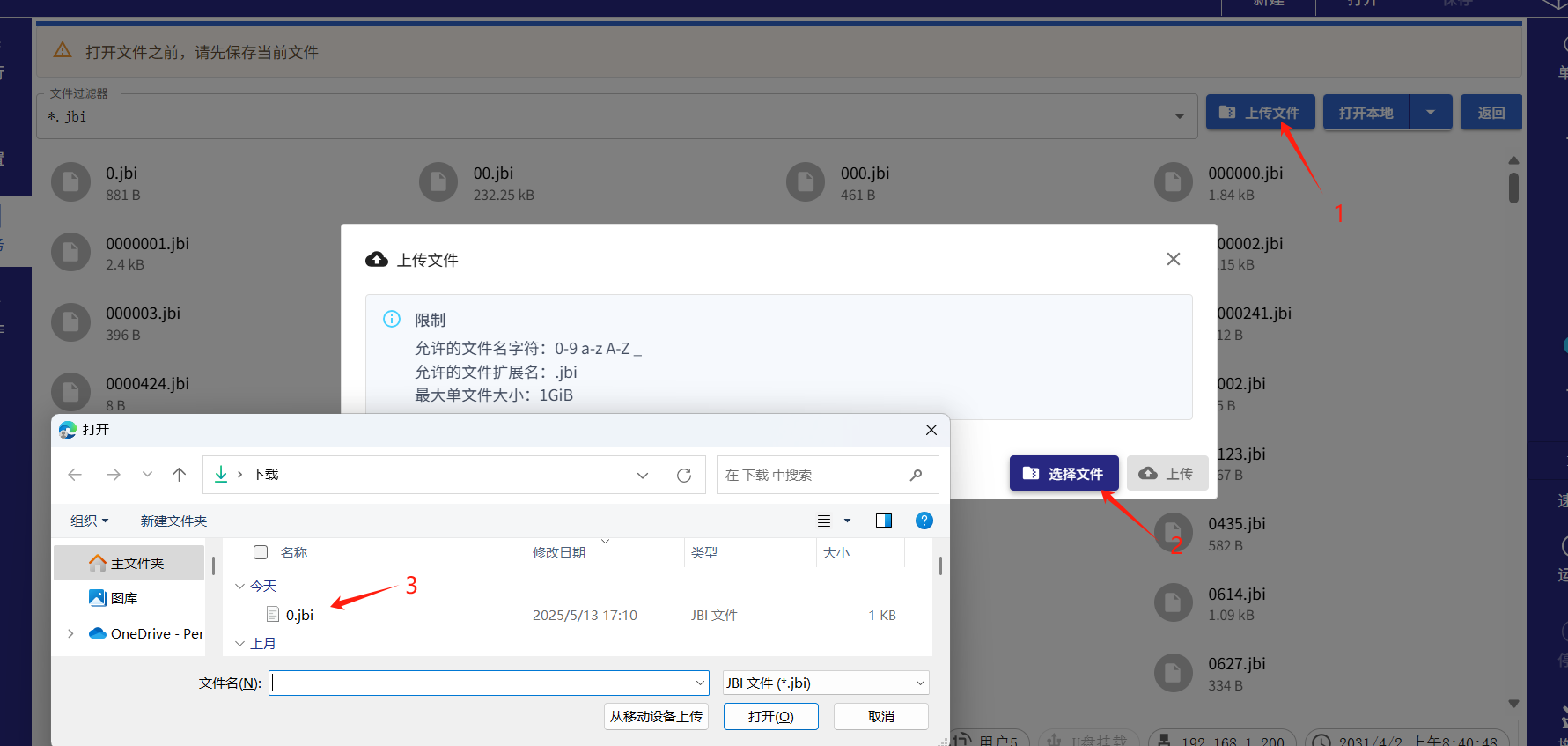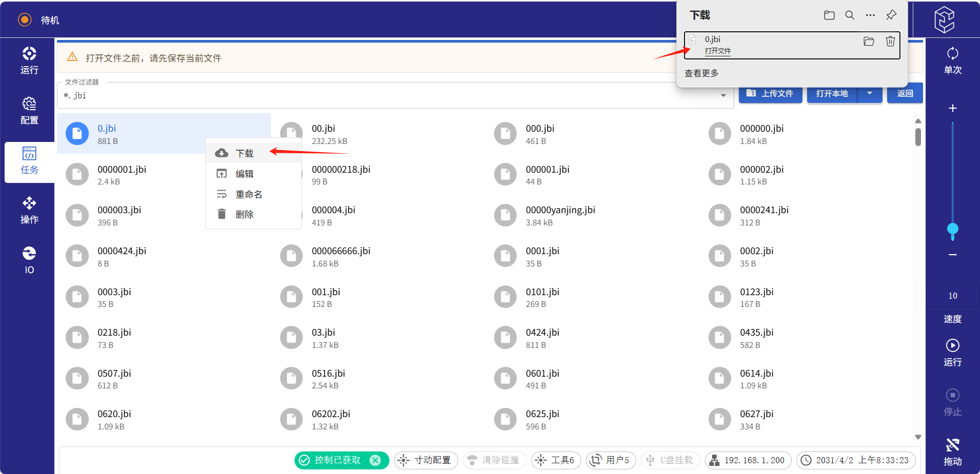 ● 备份:点击右上角“打开”,进入文件页面。如下图显示JBI文件,找到对应JBI文件名,鼠标右键选择下载。