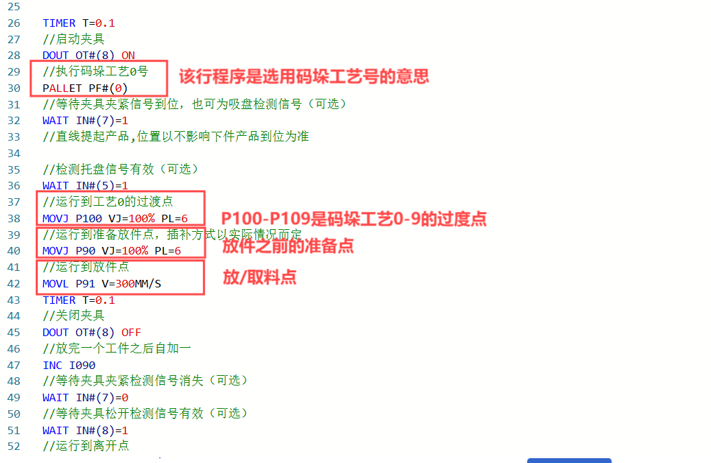 单线单垛:表示机器人从一固定的点位取料,将工件码放在一个托盘上。示例程序中标注可选的部分可根据实际 情况进行删减。