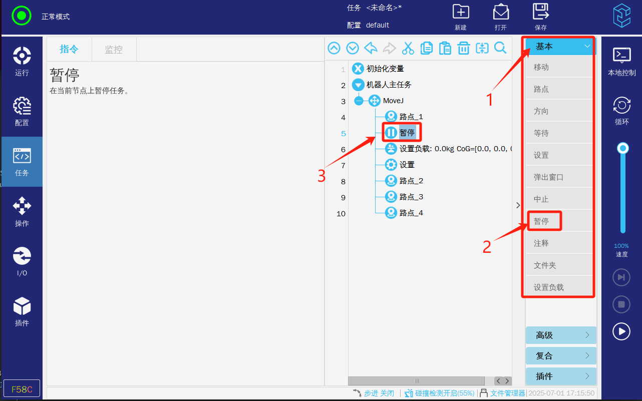 2.  点击“暂停”指令
