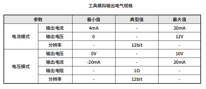 工具模拟输出为非差分输出。电气规格如表: