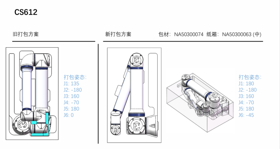 打包过程如下图所示(以 CS612 为例):使用机器人 打包程序设定调整好打包姿态时,(旧款纸箱将本体垫块垫在肩部关节与手腕关节之间,确认起到充足的支撑作用后),将本体放入下包材中,确认整个大臂和肘部关节被有 效支撑后,盖上上包材,最后封好纸箱。