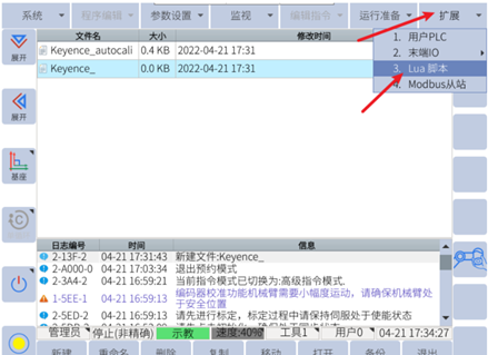 IO模块所使用的脚本程序可查看随同文档一起的“kuozhan_io.lua”程序或者咨询ELITE技术人员;准备一个U盘,在U盘根目录下新建rbctrl文件夹,并在该文件下新建luadir文件夹,将配套的脚本(.lua格式)放到luadir文件夹下,并将U盘插至控制柜U盘口。