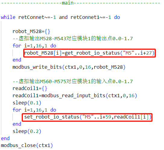 如固定好的M变量M528-M543被其他程序占用,想要更换M变量的映射,可在lua脚本程序中,更改对应的IO模块所映射的虚拟输出变量的值即可。如下图lua程序中默认是从IO模块的输出是从M528开始,IO模块的输入是从M560开始。