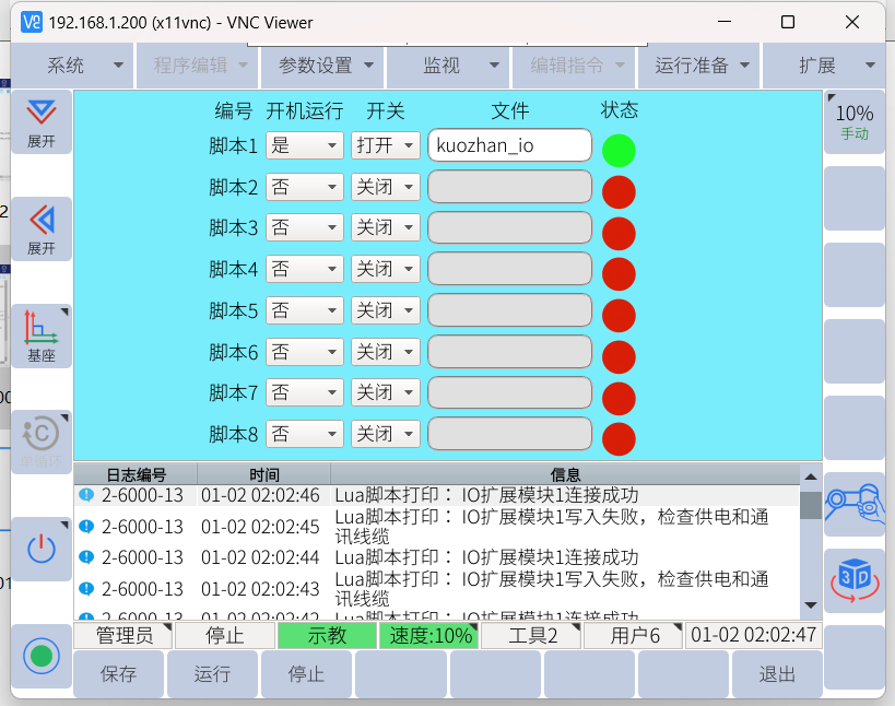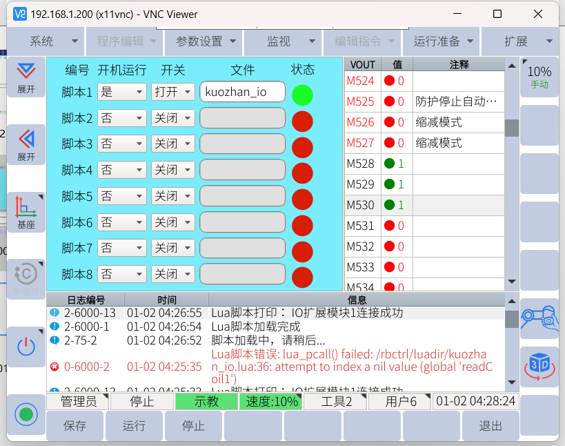 做完上述操作后就已经把 IO 模块的输入输出信号映射到机器人虚拟输出M变量内,以下就可以用机器人虚拟输出M变量控制IO模块的输入输出: