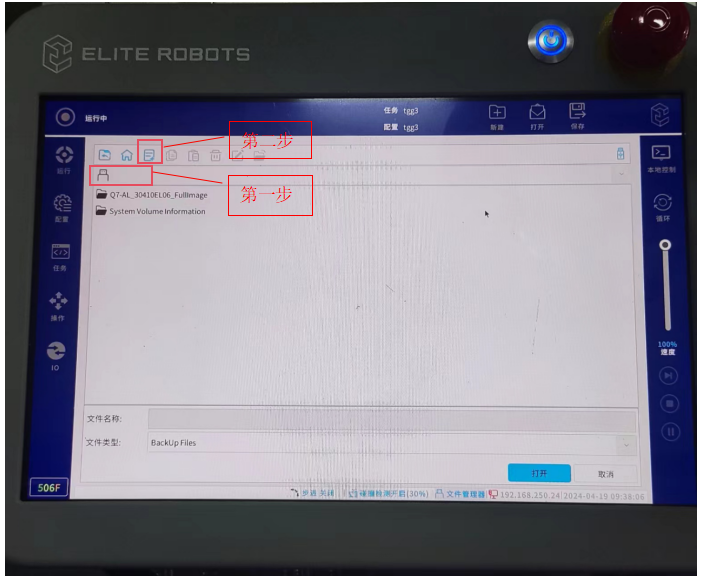 2.3.5.2按图-20所示操作步骤,系统>恢复>选择文件(U盘找到B控制柜备份程序文 件)>点击打开>开始恢复。