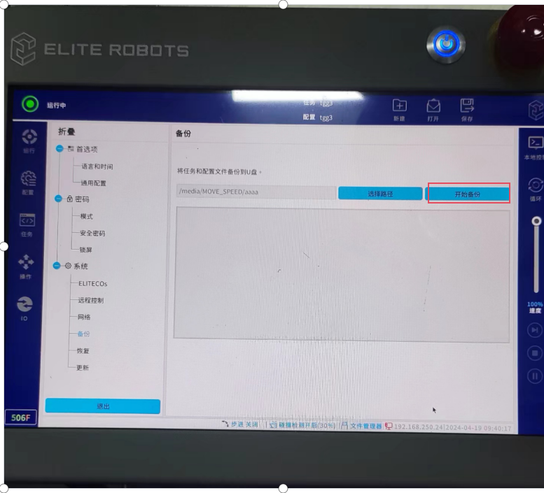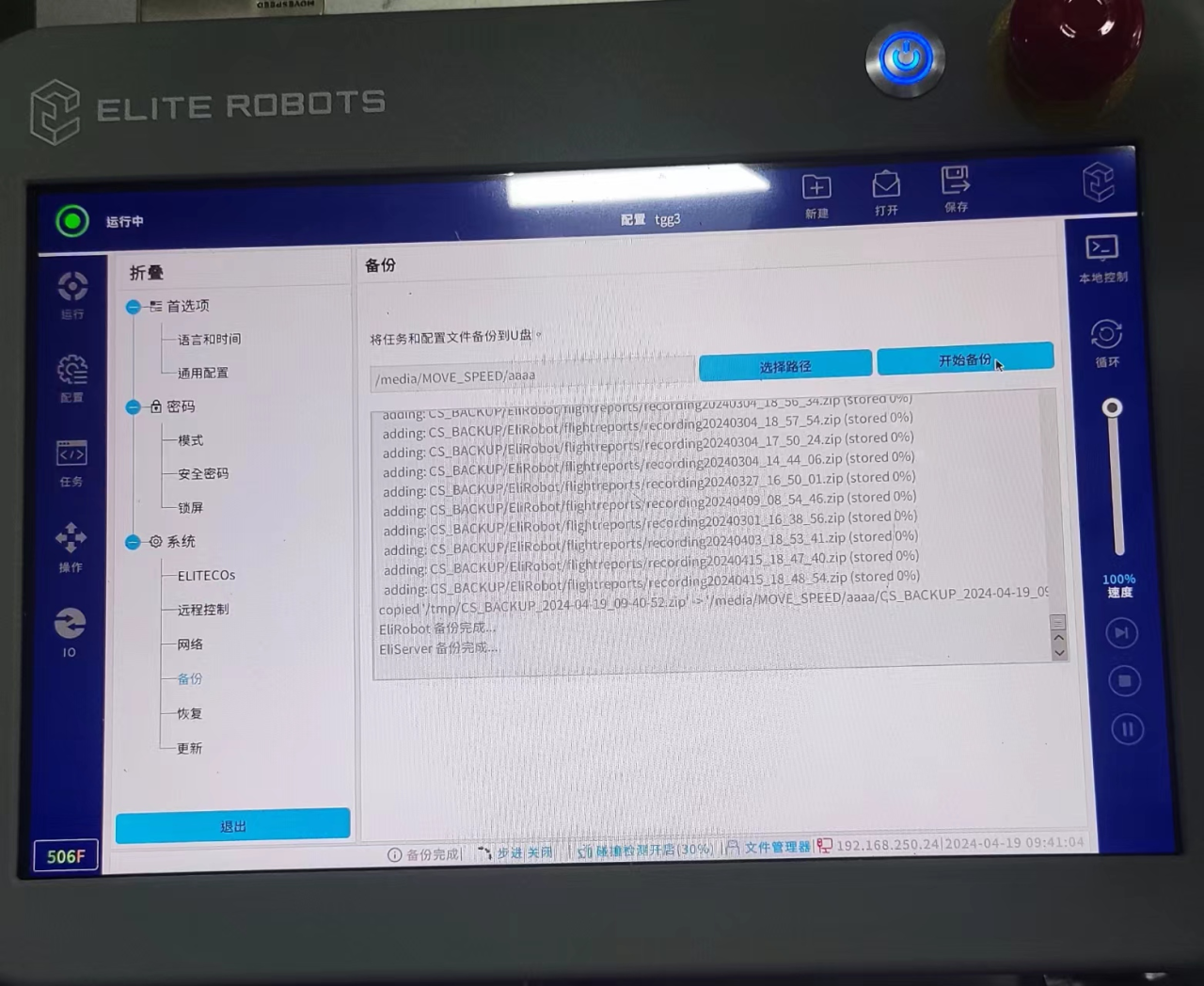 第一步:将A本体的出厂备份文件存放在 U盘,将U盘插入示教器USB口。(出厂备份 文件请咨询米兰·(milan)中国技术提供)