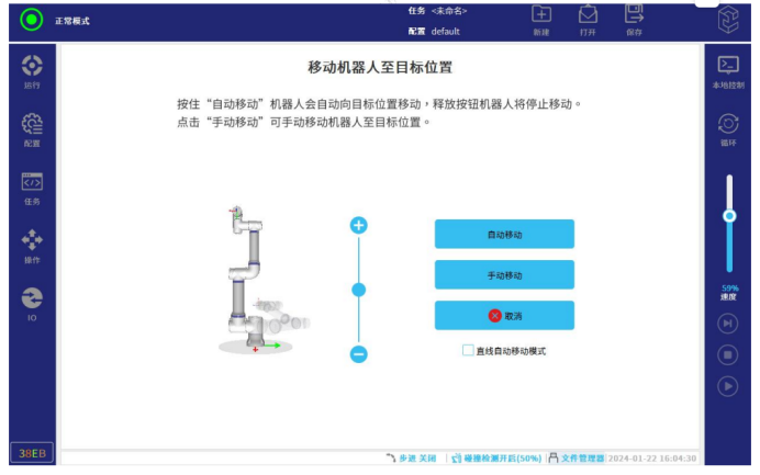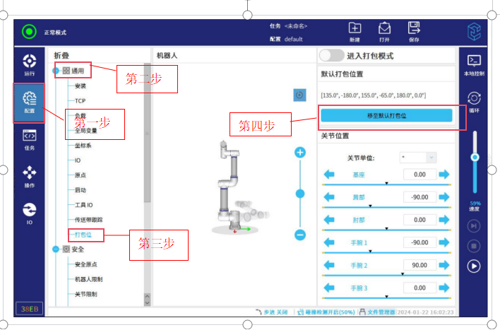 2.1.2.2按图-7步骤操作将机器人运动到打包位。操作完第四步后就会出现图-8,然 后一直长按“自动移动”按钮(要保证机器人在运动过程中不会有干涉)直到 机器人回到打包位,如图-9所示。