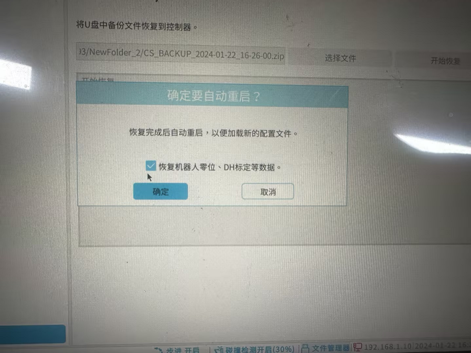 2.3.5.3按照图-21所示,不勾选恢复机器人零位、DH标定等数据>确定,等待恢复完 成即可。