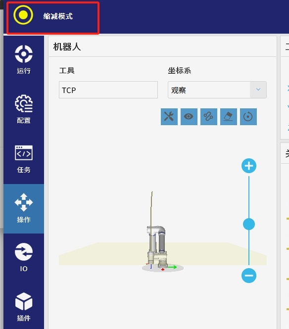 4.  如果机械臂进入缩减模式,右上角会变成黄色指示按钮,机械臂末端法兰指示灯会变为绿蓝交替灯状态。