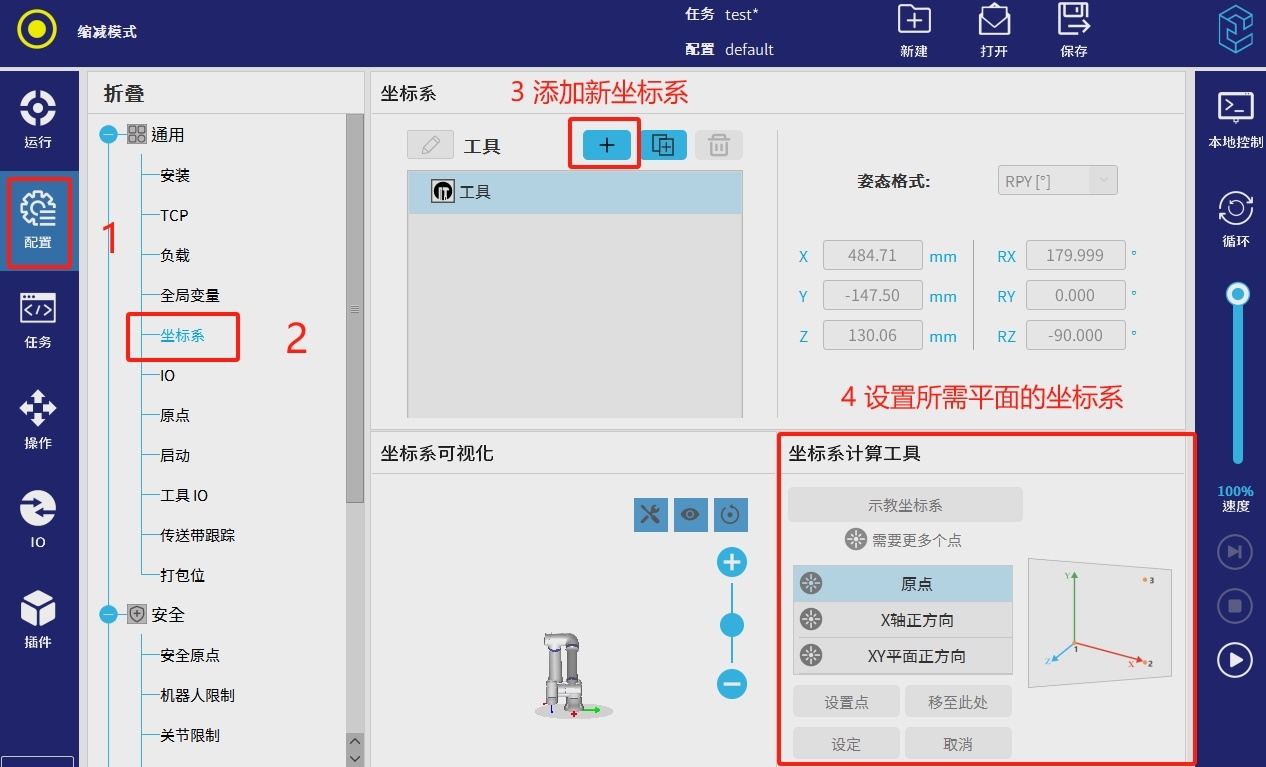1.   要设置安全平面需要先设置一个坐标系,因为安全平面是基于你设置的坐标系的X,Y平面的Z方向平移来确定具体位置的。用户坐标系的设置请参照用户手册上面设置。