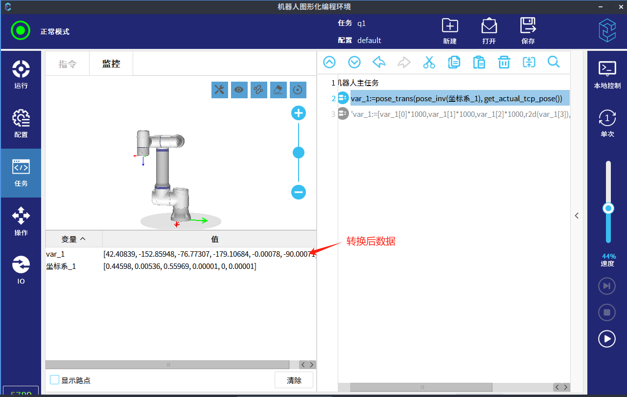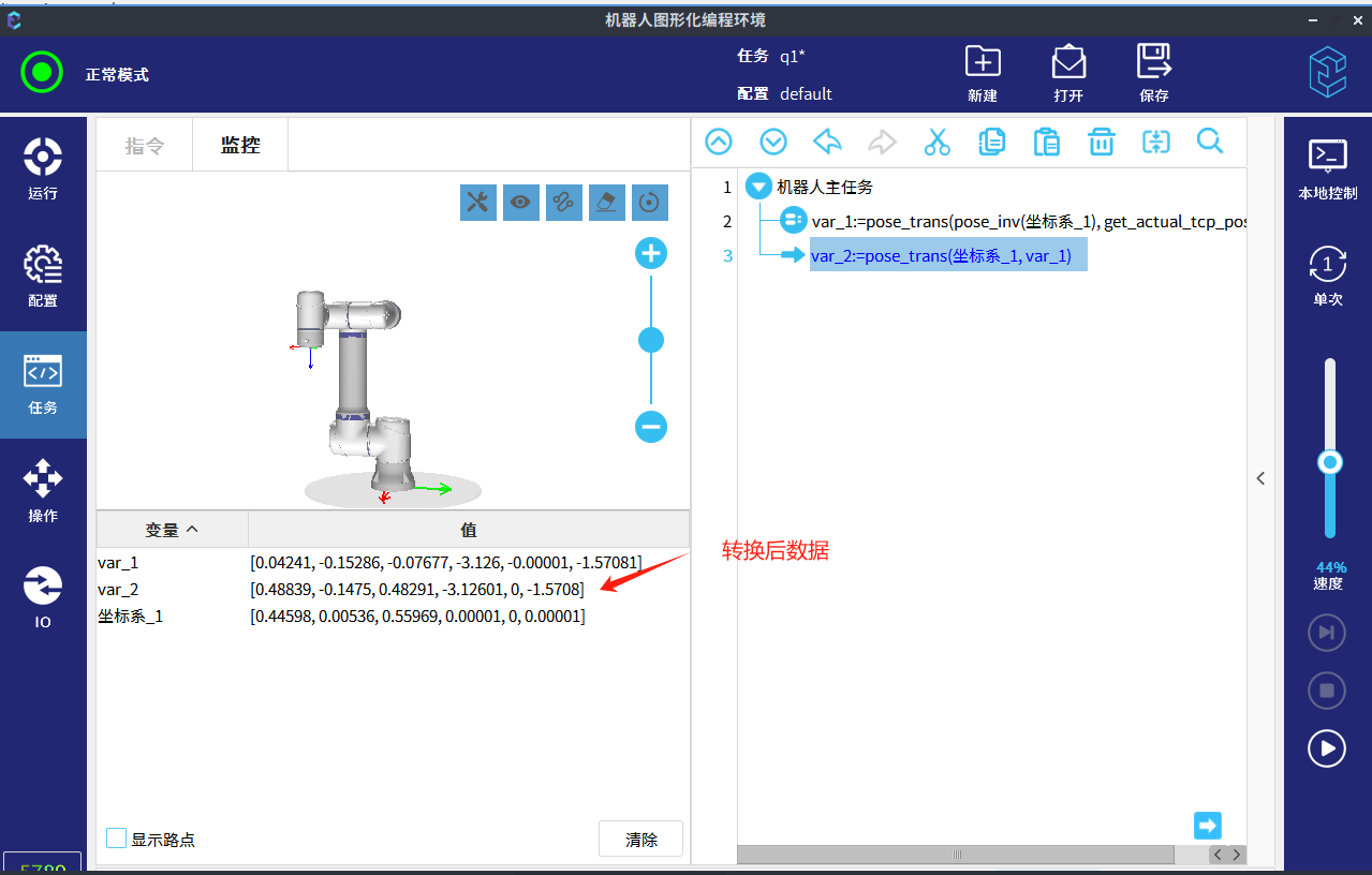 根据位姿变换指令,将user坐标系(坐标系_1)下的位姿(下方示例中var_1)转换成base坐标系下的位姿(var_2)