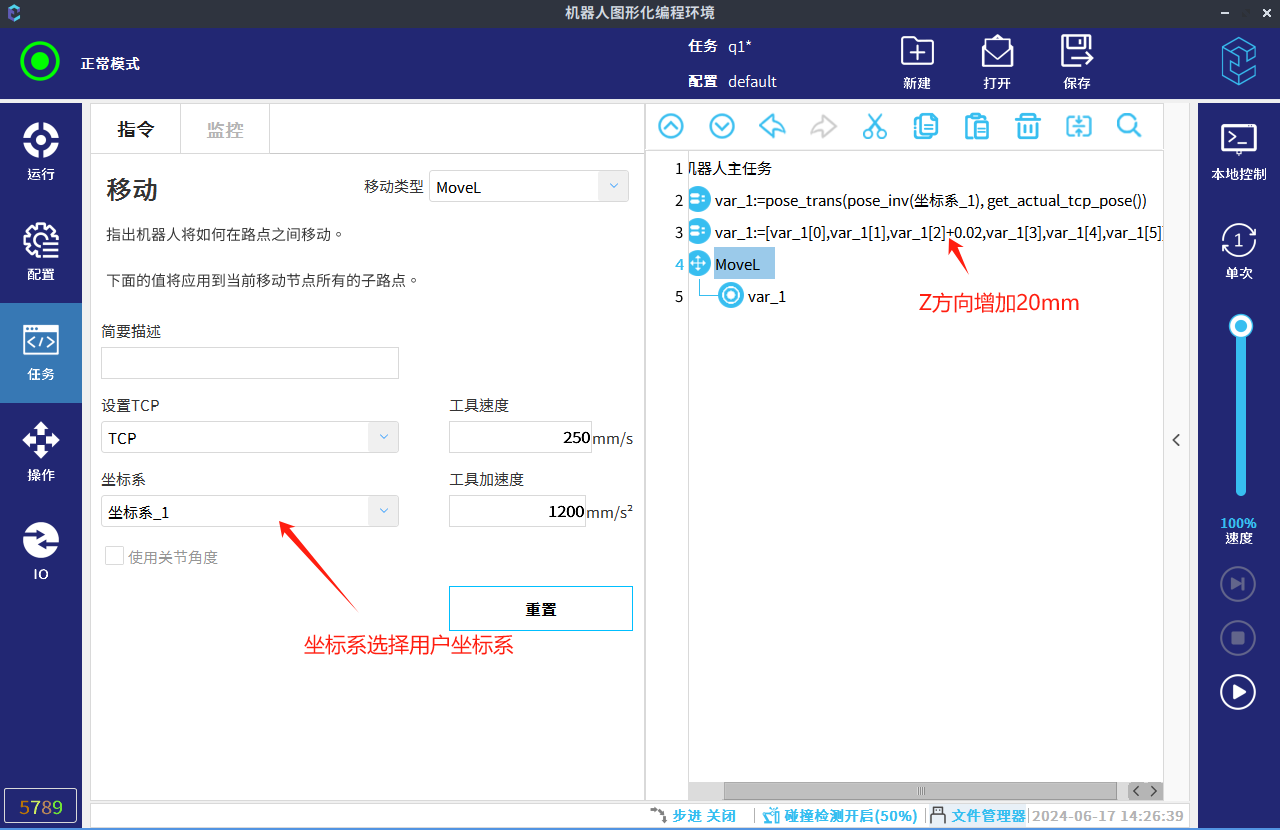 获取到用户坐标下位姿之后,可更改该数据,插入moveL指令(位姿数据用movel指令,关节数据用movej指令)路点类型选择为可变路点。